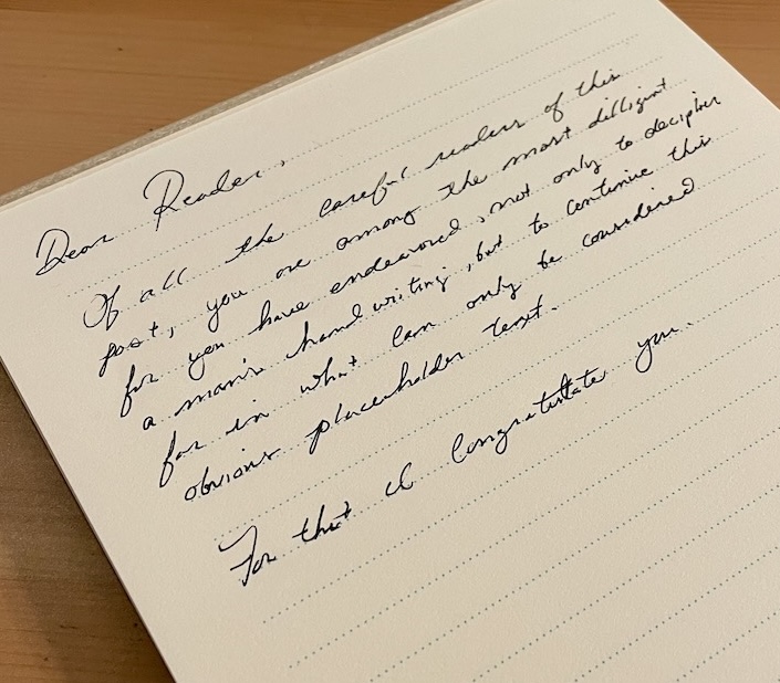 In early 2020, a family member took a job far from home and, because of the nature of the work, would therefore be out of cell service for large swaths of time. As a gag, we decided to communicate via long-form letters over email as well as the occasional postcard. Later that year, in the grips of a pandemic, my D&D group went virtual, but that came with several drawbacks—including the sudden lack of the ability to pawn chewing gum off of me during games.1 So, before our first virtual game, I mailed every one a pack of gum, to be opened on the call.
